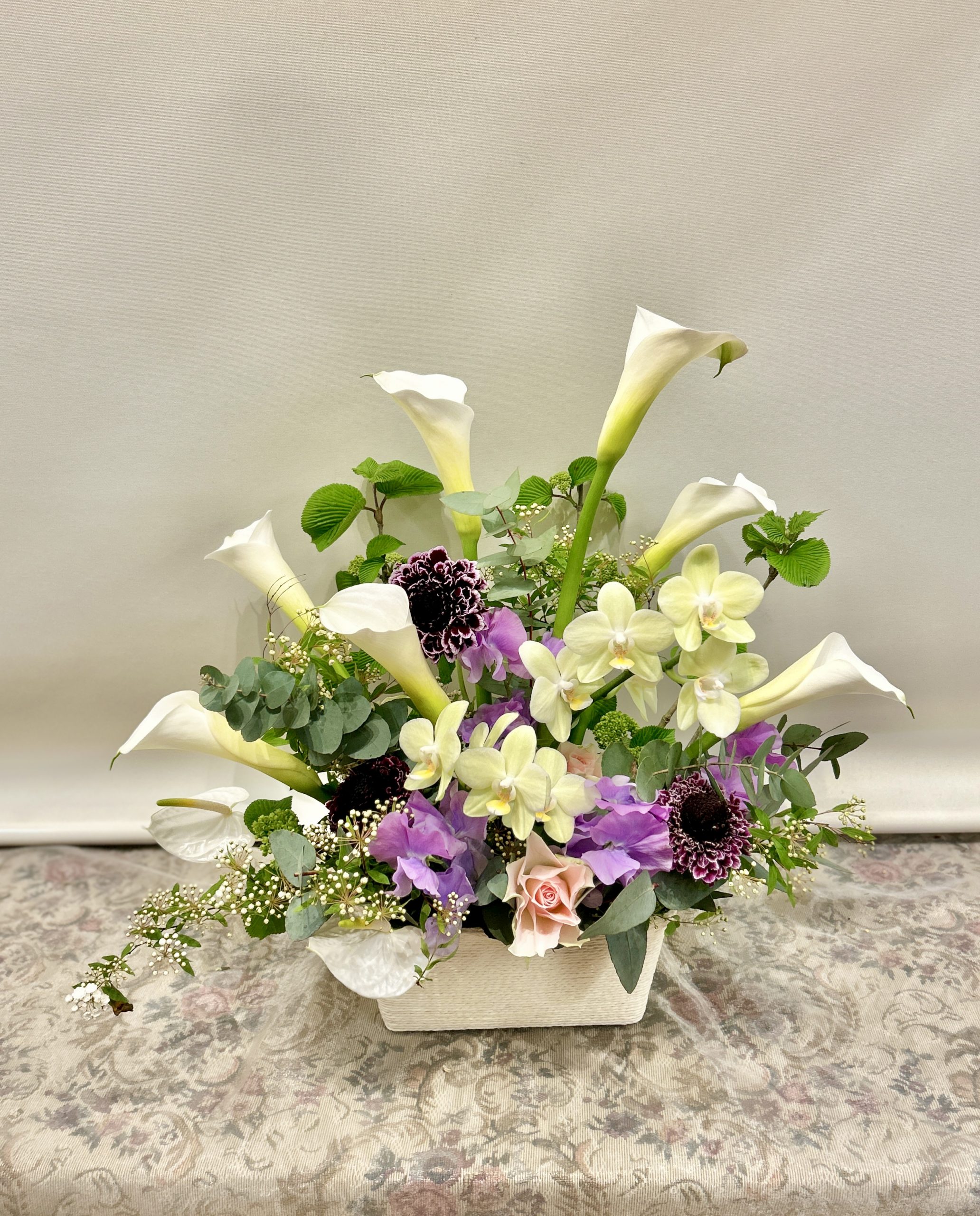 白色と紫色のリクエストカラーのアレンジメント、